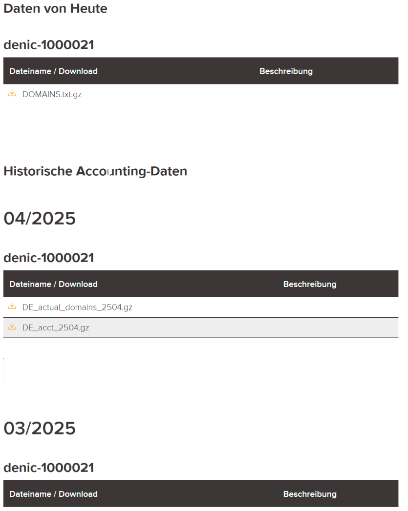 Im Mitgliederbereich stehen Listen mit Accounting-Daten zur Verfügung. Diese gliedern sich in Listen mit dem tagesaktuellen Domainbestand und in Accounting-Daten der letzten 6 Monate, bestehenden aus Abrechnungsdaten in Form einer Auflistung aller domainbezogenen Aufträge und dem Domainbestand in dem jeweiligen Monat.