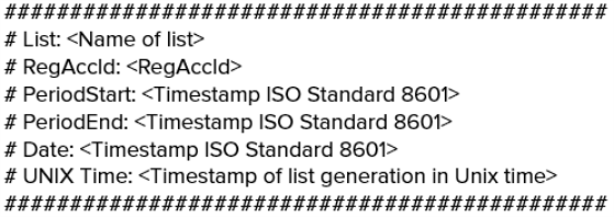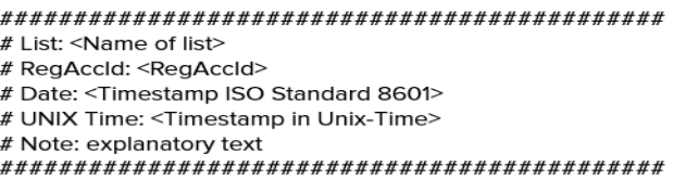 | UNIX Time | The "UNIX Time" field state the point in time when the respective list was generated in UNIX time format. |